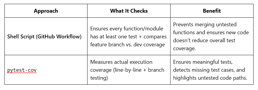 pytest --cov=pipelines/modules --cov-report=term-missing --cov-fail-under=$COVERAGE_THRESHOLDA custom shell script (.github/scripts/check_missing_tests.sh) ensures that: